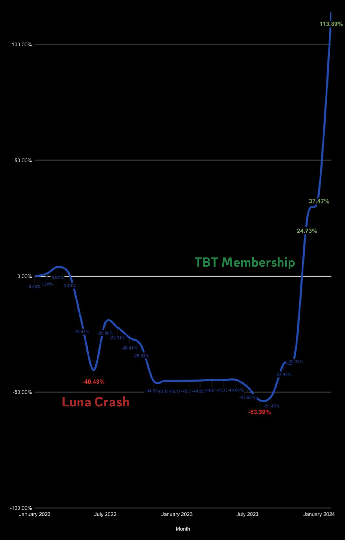 As a new trader, both the Club and Standard Membership tiers are perfect for you. Both provide access to our exclusive trading community, an invaluable resource for learning from other traders, getting questions answered, and communicating directly with Aaron Dishner and our TBT staff. Plus, you'll gain access to an entire toolkit of trading tools and other valuable Discord threads and alerts, like new trade setups and our private monthly watchlist of coins (a member favorite - it has been incredibly packed with profitable coins!).